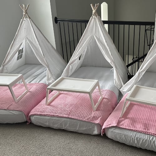 Create a memorable sleepover without the high cost. The Pink DYI Tent Package is a budget-friendly, customizable sleepover tent set designed for indoor parties and cozy nights. This ready-to-personalize package gives you the essentials—white teepee tent, twin air mattress, fitted sheet, pink blanket, and a white tray table—so you can style, decorate, and upgrade to match any theme.