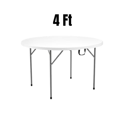 Make hosting simple with the 4 ft Foldable Table - White. This 48” round folding table seats 4–6 guests. It blends a heavy-duty plastic top with a sturdy steel frame for dependable performance at parties, vendor booths, and everyday gatherings. Fold-in-half portability and a built-in carry handle make transport and storage effortless.